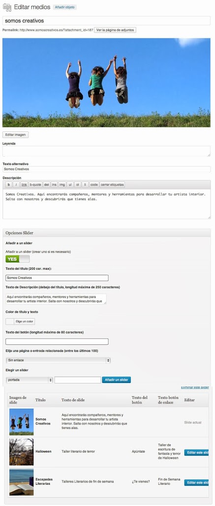 Ahora ve subiendo todas las imágenes que quieras que se vean en tu portada. Sigue los mismos pasos, pero en lugar de crear un nuevo slider, elige el que quieras del combo que aparece en la opción «Elegir slider».