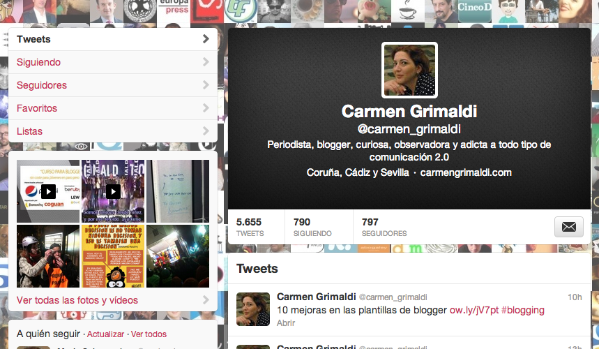 Como ya dije antes, en este apartado puedes ver toda tu actividad en Twitter. Cuántos seguidores tienes, a cuántas cuentas sigues, cuántos Tweets has publicado desde tu inicio, tus Tweets favoritos y tus listas. Tambíén se puede ver de un golpe todas las imágenes y vídeos que has publicado.Todo acabará definiendote, así que…piensa lo que haces y no olvides nunca que te estás enseñando al mundo.